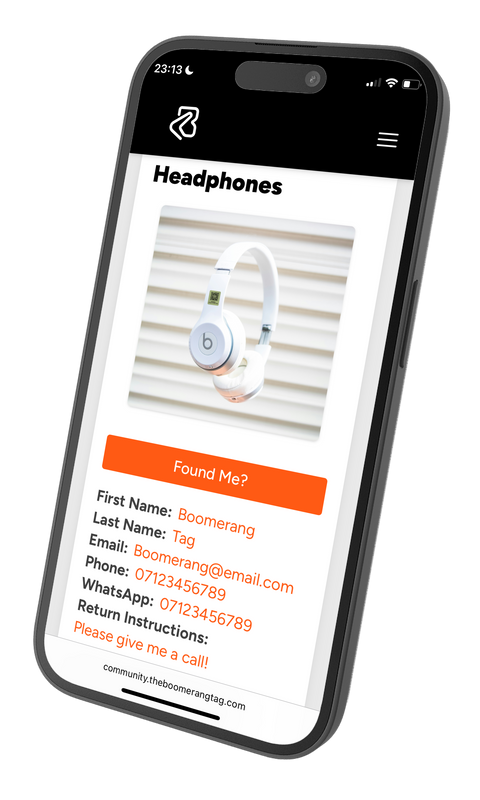 Leave no information and finders can send you a message through Boomerang® via a big orange "Found me" button. You're notified by email, WhatsApp and SMS. This means neither finders nor owners need to share any personal details in order to return items.